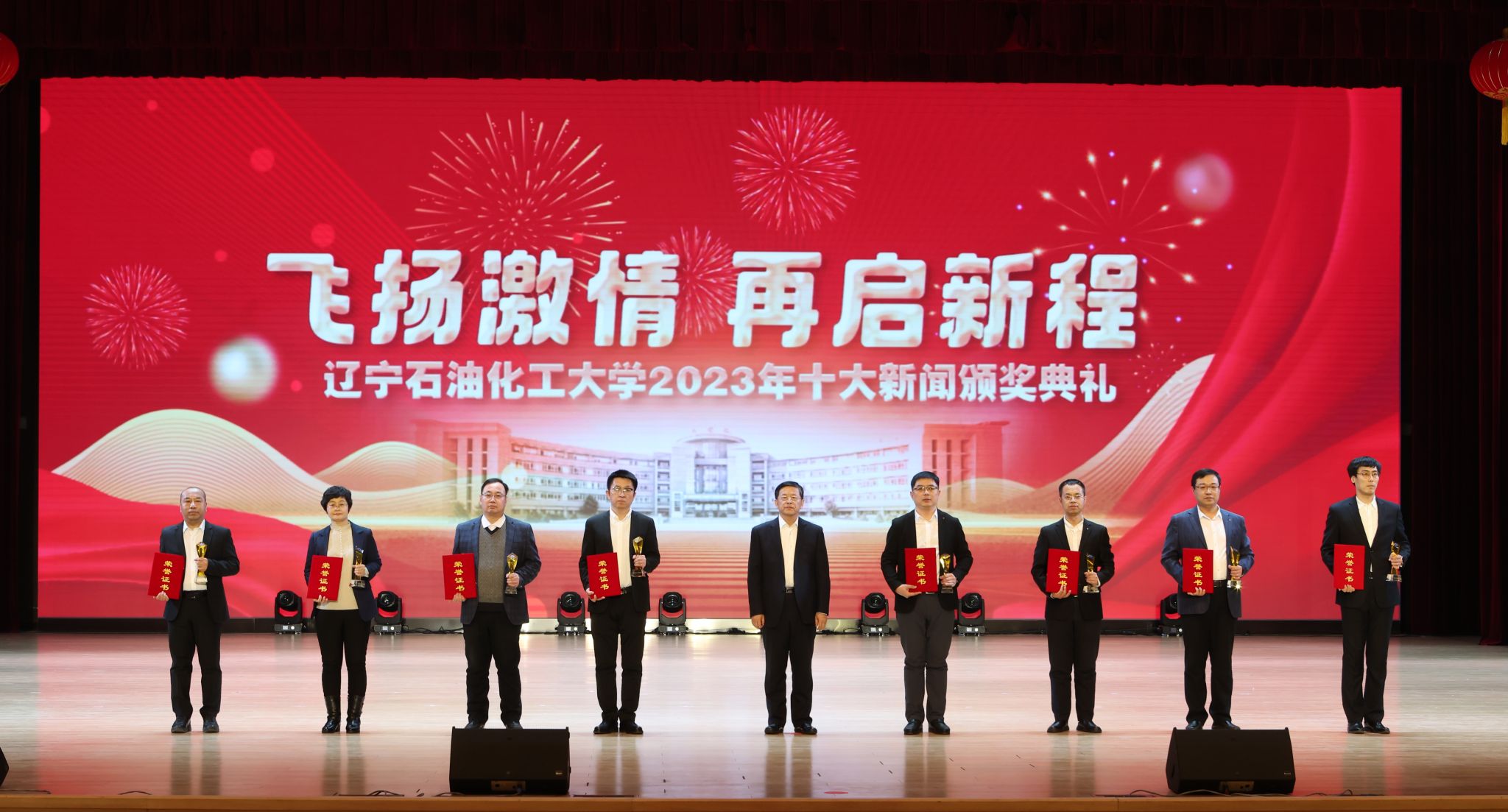 岁序常易,华章日新,学校十大新闻颁奖典礼至今已经成功举办了五届。带着2023年的辛勤耕耘与满满收获再启新征程,全体辽石化大人将继续稳中求进促提升,以进促稳谋突破,争分夺秒抓紧干,在加快推进特色鲜明的一流高水平应用型大学建设道路上赓续前行,奋力书写2024年辽石化大踔厉奋发、飞扬激情、团结筑梦、接续奋斗的崭新篇章!(撰稿人:娄永利 刘桓璐 校对人:陈雪峰 审稿人:雷冬海/张永利 摄)